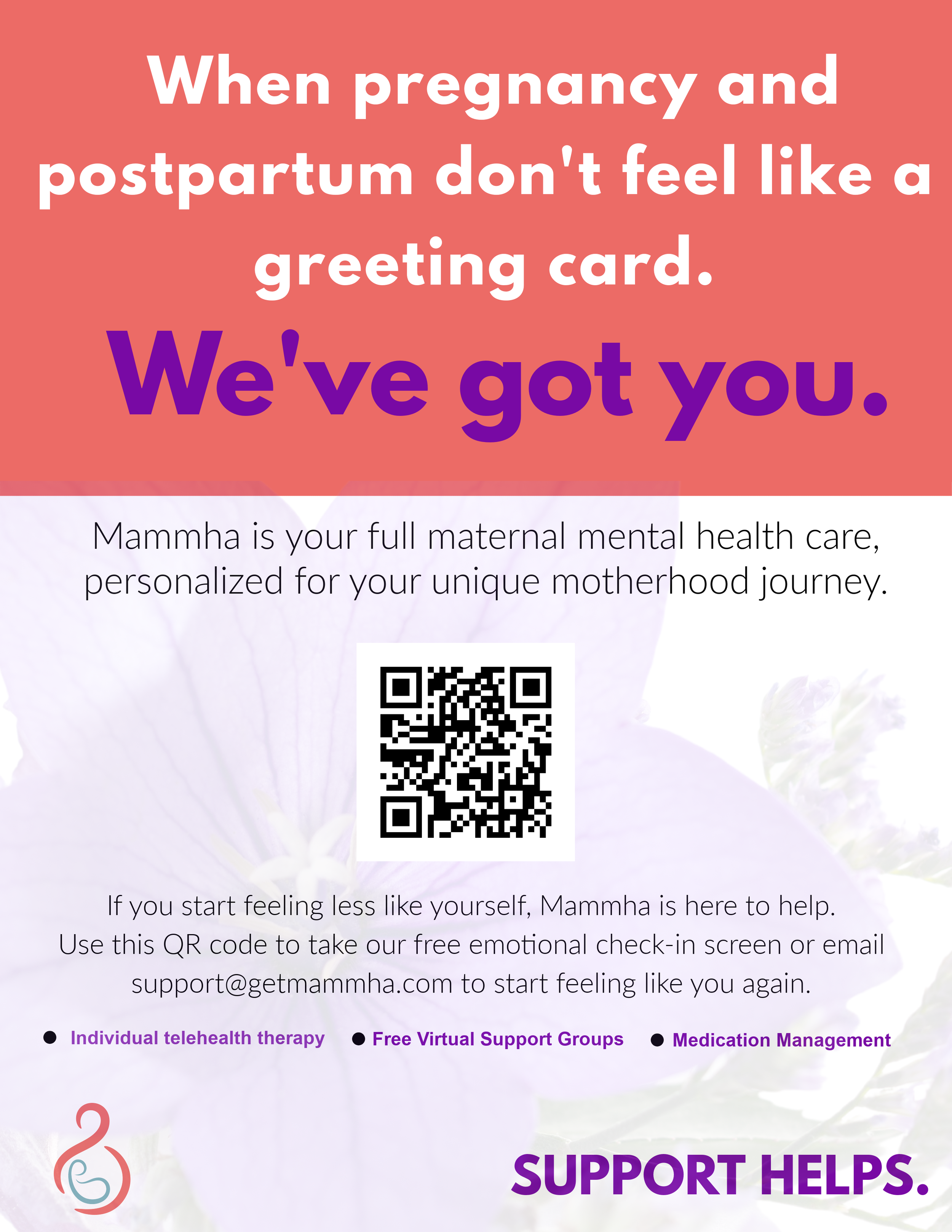 Access to Mammha’s App for Parents that has robust wellness content, chat groups, a mood tracker, and soon live audio support groups and on demand courses and content for FREE for your patients.
