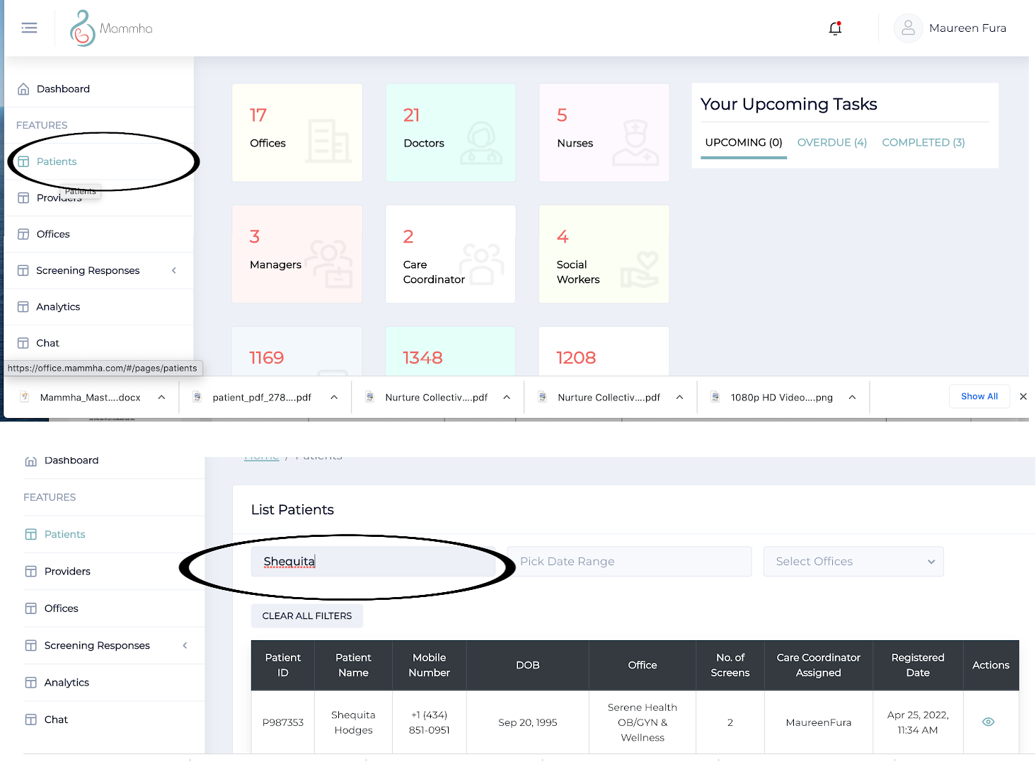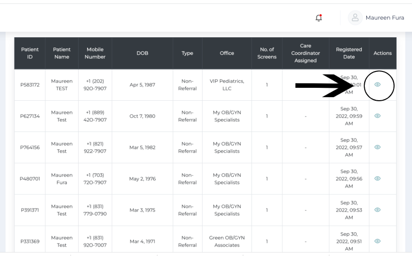 You will see a roster of patient names. Click on the eye icon to open the screen record.