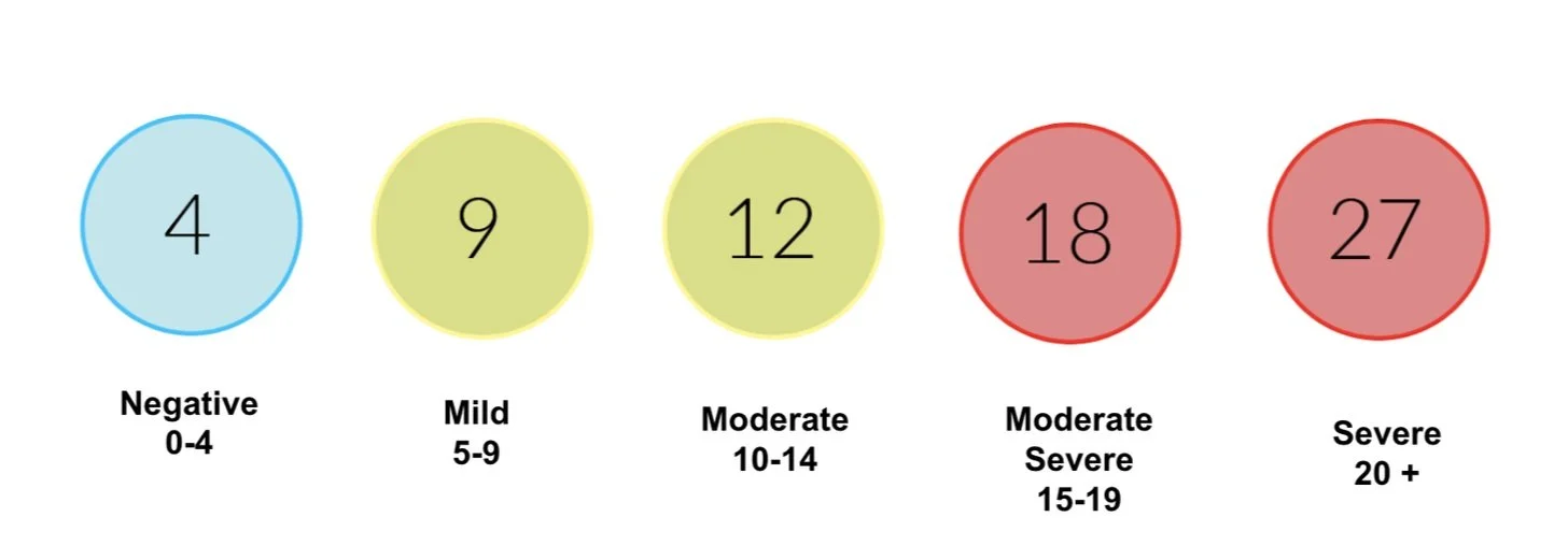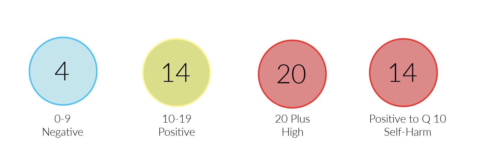 Mammha uses the PHQ-9 to screen non-perinatal patients, these are patients who are non-pregnant and have not had a baby in the last year. Below are the score cut-offs for perinatal patients.