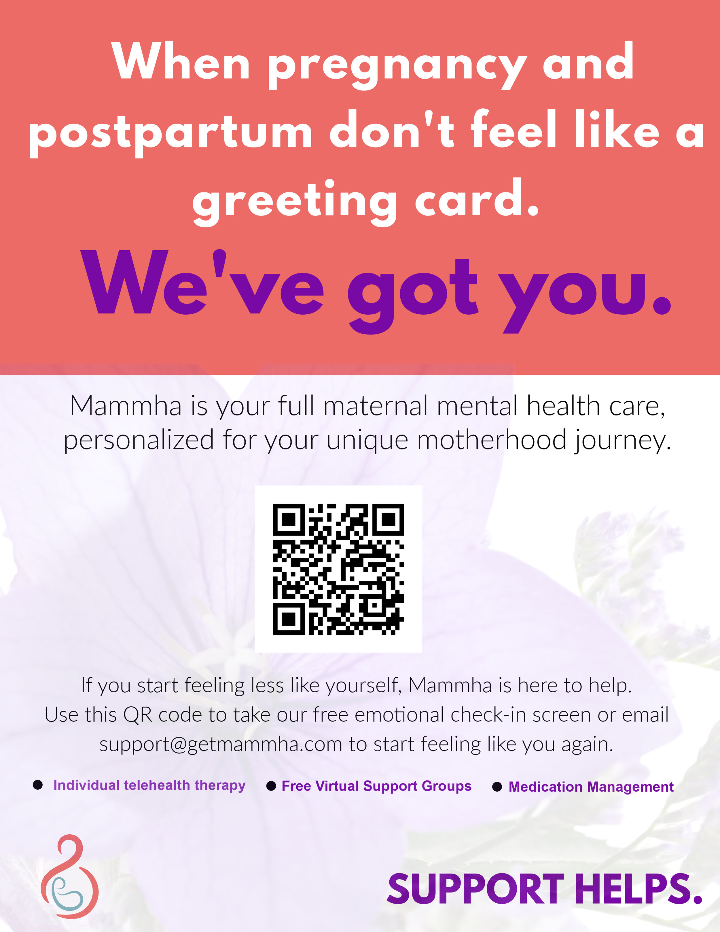 Access to Mammha’s App for Parents that has robust wellness content, chat groups, a mood tracker, and soon live audio support groups and on demand courses and content for FREE for your patients.